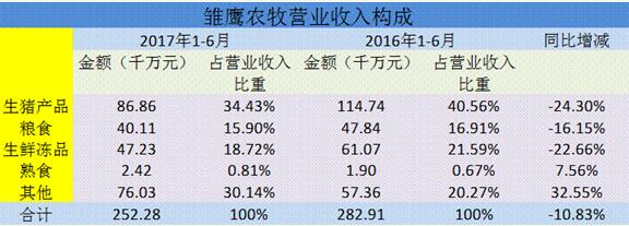 8月12日,雏鹰农牧发布2017年半年度报告。报告显示,雏鹰农牧上半年销售生猪119.38万头;实现营业收入25.23亿元,同比下降10.83%;生猪板块营业收入13.61亿元,同比下降23.39%。归属于上市公司股东净利润4.6亿元,较去年同期增长1.34%。