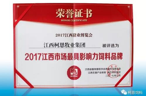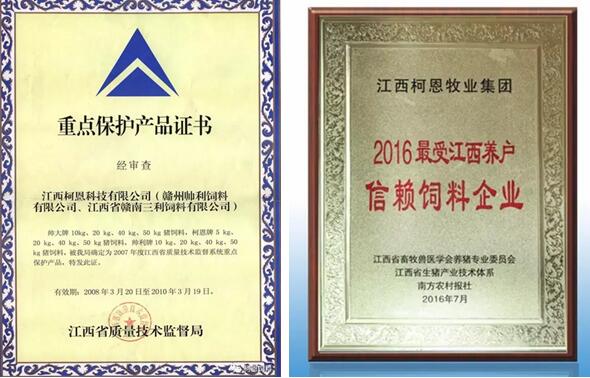 柯恩饲料早在2008年就被江西省质量技术监督局认定为江西省重点保护产品,这也是当年唯一获得该殊荣的江西省饲料品牌。2016年、2017年,柯恩饲料再次被南方农村报社等单位评选为“最受江西养户信赖饲料企业”和“江西市场最具影响力饲料品牌”。