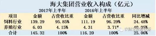 8月17日,海大集团发布2017年半年度报告。报告显示,2017年上半年海大集团营业收入145.32亿元,同比增长25.06%;利润总额达6.48亿元,同比增长31.17%;归属上市公司股东净利润5.19亿元,同比增长34.89%。