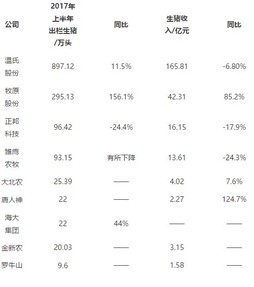 截止到2017年8月19日,多家上市企业已纷纷发布2017年上半年业绩快报,受猪价影响,养猪企业净利润增长率大幅下降,饲料企业受影响较小。根据已公布企业数据,排名整理如下。