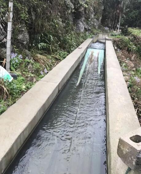 陈金明的养鱼池在离县城一个多小时车程的距离。走进基地,听得潺潺水声。在远处一水泥石槽半倚山间,自山腰延伸到基地的鱼池中。沿着石槽往上,半山间一处山洞显露出来,洞中有泉水奔流而来,流入过滤池,再流入基地的鱼池中。