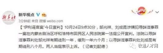 今日(10月24日)上午,呼和浩特市回民区人民法院官微发布:10月24日上午9时30分,“伊利谣言案”中的邹光祥、刘成昆涉嫌犯寻衅滋事罪一案在内蒙古自治区呼和浩特市回民区人民法院第一法庭公开宣判。法院以寻衅滋事罪判处邹光祥有期徒刑一年,缓刑一年六个月;以寻衅滋事罪判处刘成昆有期徒刑八个月。两人当庭表示上诉。