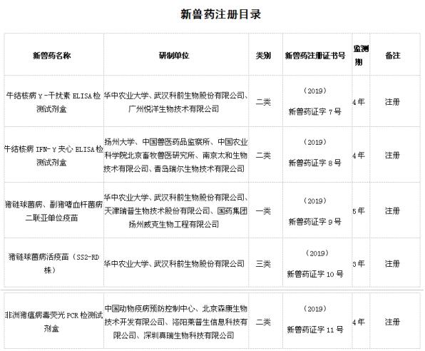 2019年01月30日,农业农村部发布第130号公告,根据《兽药管理条例》和《兽药注册办法》规定,经审查,批准华中农业大学等14家单位申报的牛结核病γ-干扰素ELISA检测试剂盒等5种兽药产品为新兽药,核发《新兽药注册证书》,发布产品试行规程、质量标准、说明书和内包装标签,自发布之日起执行。